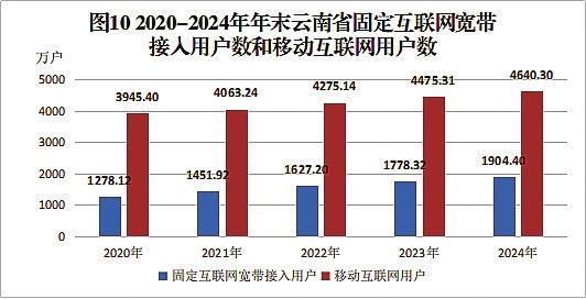 图10 2020—2024年年末云南省固定互联网宽带接入用户数和移动互联网用户数