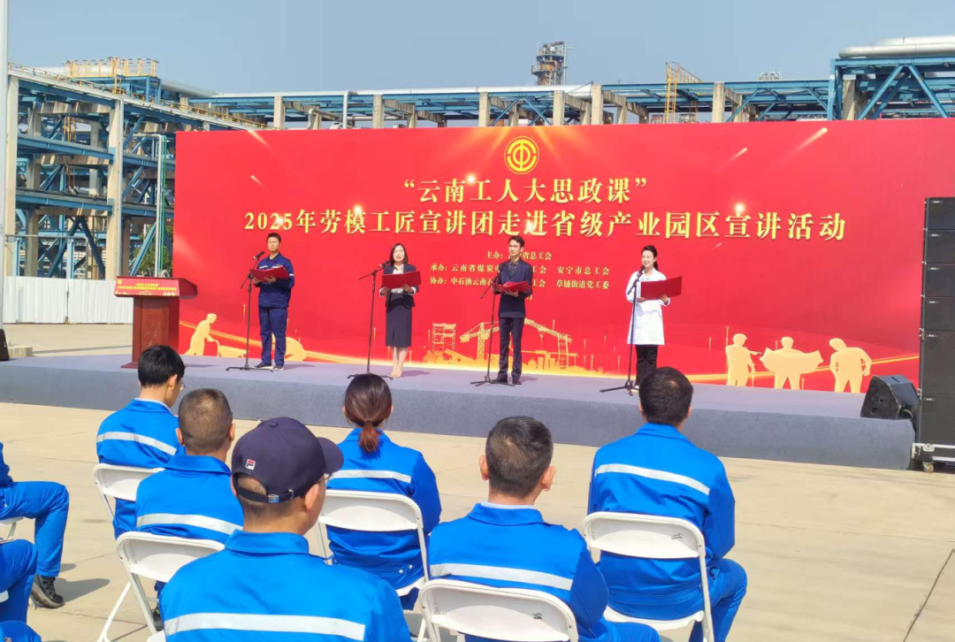 在中石油云南石化有限公司举办的专场活动,将思政课搬到了工业园区生产一线,生产设备作背景,能源石化、地质勘探领域的4位劳模工匠作分享,告诉产业工人新时代电力产业工人如何奋发进取、建功立业。