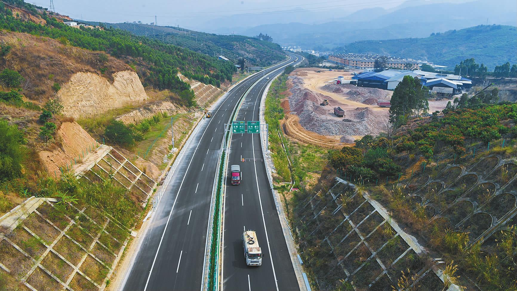 近日,工程运输车在永金高速红光段运送建设物资。