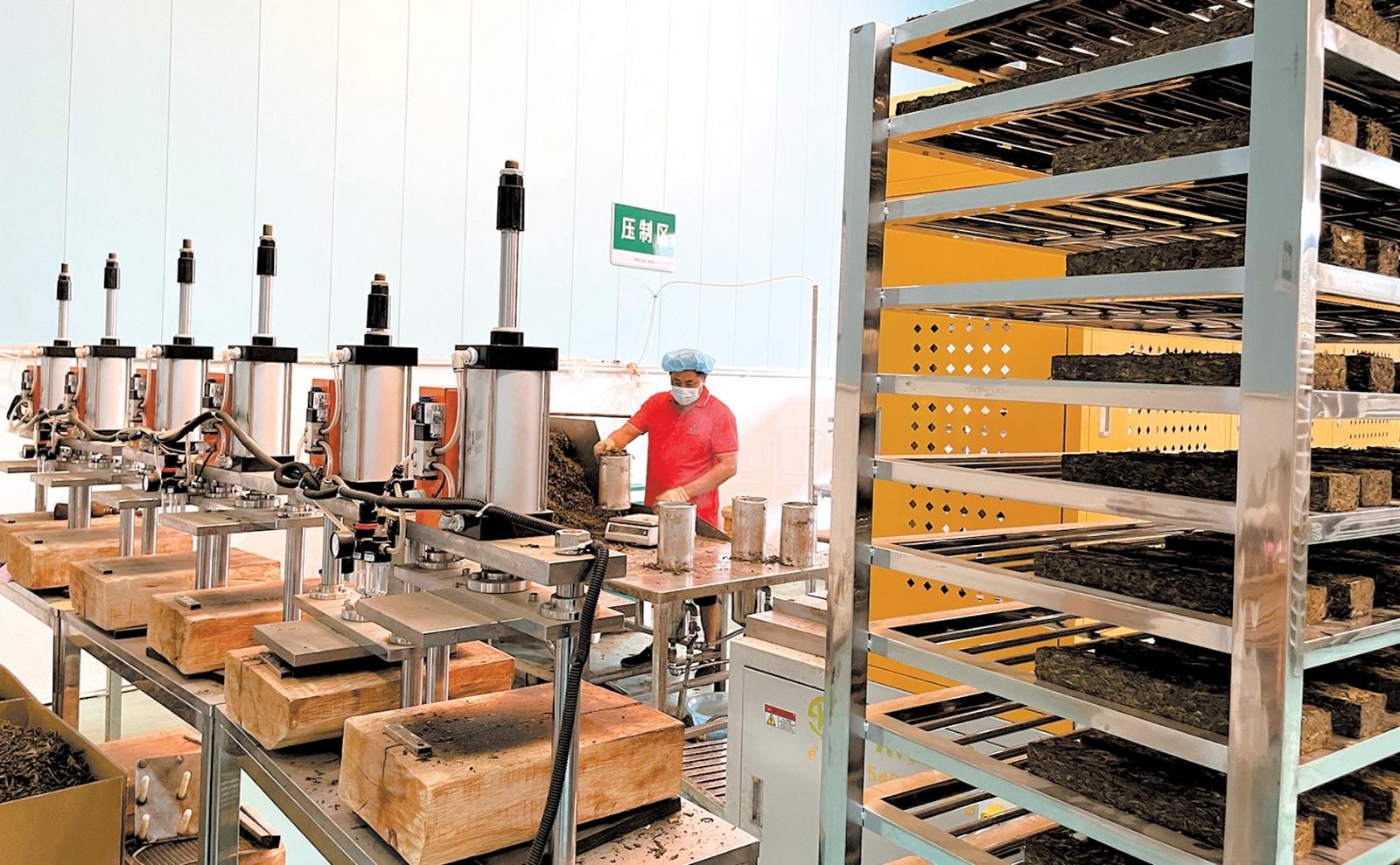 一名送茶来加工的茶农看着一车车包装精美的茶叶,乐呵呵地说:“把茶叶拿来这里加工,通过智能化设备的精选、专业压饼,紧压茶厚薄适中、品质比较好,售卖价格能提升15%至20%。”