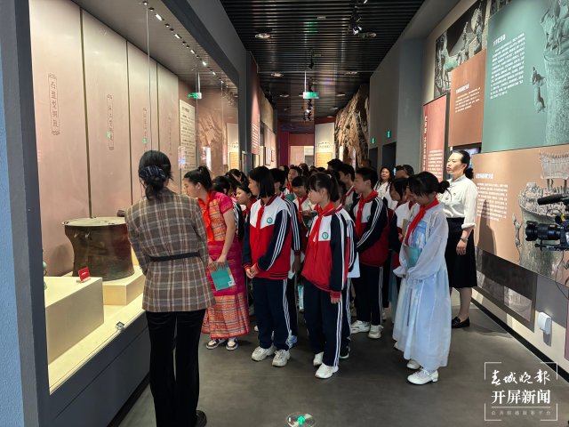 这堂思政课采取了场馆教学和课堂教学相融合的方式。杨家中心学校的同学们首先来到云南民族博物馆主展厅进行场馆教学,解说员带领同学们参观了"铸牢中华民族共同体意识"展览,课堂主要聚焦民族服饰、节庆、建筑三大文化符号认识和学习。