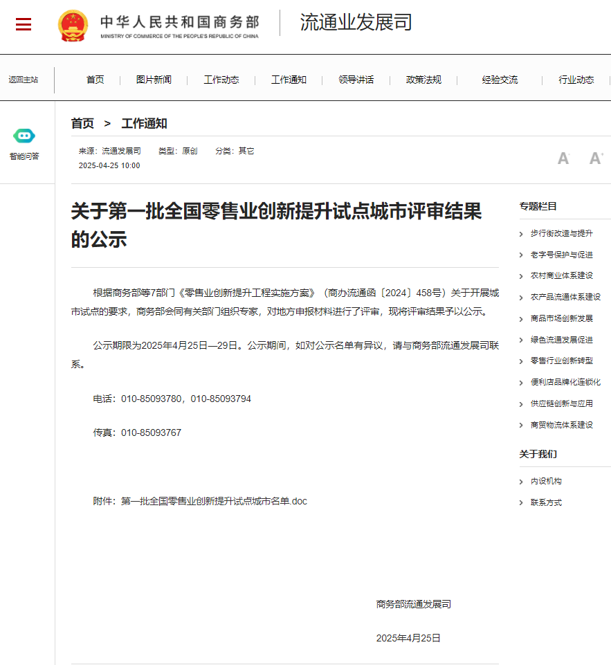 据《零售业创新提升工程实施方案》,商务部牵头开展零售业创新提升试点,择优将积极性高、基础好、政策实的城市纳入全国试点。试点建设周期为两年(从确定试点时间起算),2025—2029年每年确定一批试点城市,适时推广案例和经验,探索形成长效机制。鼓励同步开展省级试点。