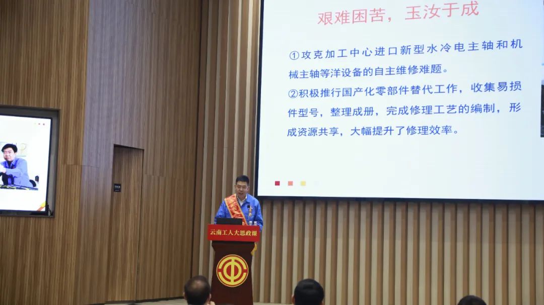 宣讲会上,昆明云内动力股份有限公司高级工程师、特级技师,国家级技能大师工作室带头人、“全国技术能手”、云南省“兴滇英才支持计划”首席技师,“云南省五一劳动奖章”获得者秦选以《匠心》为题,分享了他扎根基层一线,以“执着专注、精益求精、一丝不苟、追求卓越”的工匠精神破解技术难题的奋斗故事。