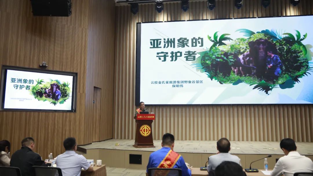 云投集团旗下西双版纳野象谷景区技术总工、云南省劳动模范、云南省五一劳动奖章获得者保明伟以《亚洲象的守护者》为题,讲述了他25年如一日执着坚守,悉心守护亚洲象的心路历程,引导广大职工树立“干一行、爱一行、专一行”的职业信念。