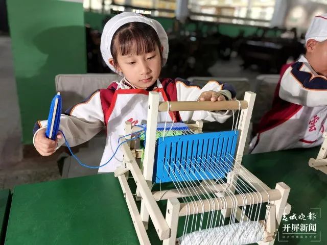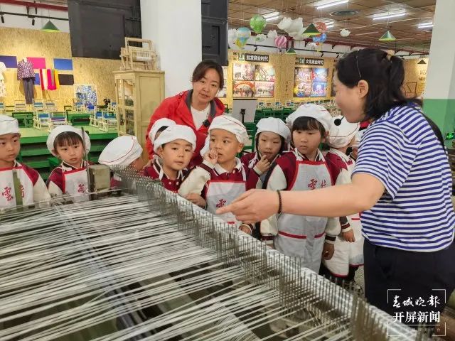 最富童趣的当数“巧手织梦”环节。在老师们的指导下,孩子们使用微型织布机体验经纬交织的奥秘:左手执梭穿线,右手拉筘固定,当第一缕彩色棉线在木架上编织成条时,欢呼声瞬间充满整个展厅。“我织的布要送给妈妈当围巾!”5岁的墨墨展示着自己的纺织作品,激动地和同伴分享劳动体验所带来的喜悦。