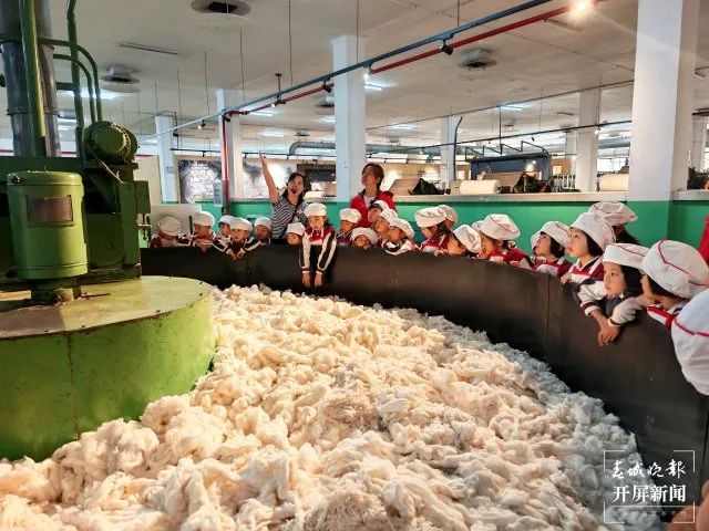 上午9时,身着迷你纺织工装的孩子们化身“小工匠”,在纺织女工的引导下开启探秘之旅。从棉田到车间,孩子们透过历史影像与实物展陈,见证棉花经清花、梳棉、并条、粗纱、细纱、络筒、整经、织布等12道工序的“变形记”。