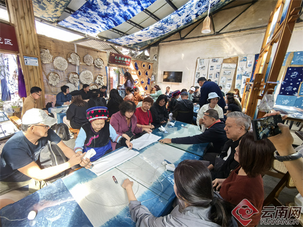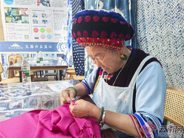 不止于此,扎染的创新发展也带动了当地就业,让许多村民在家门口实现就业。“我从小就会扎染,现在在家也没事,来这边带着游客们感受扎染的魅力,还能拿一份工资呢。”70多岁的阿婆昆和一边说,手上还不停缠着线。