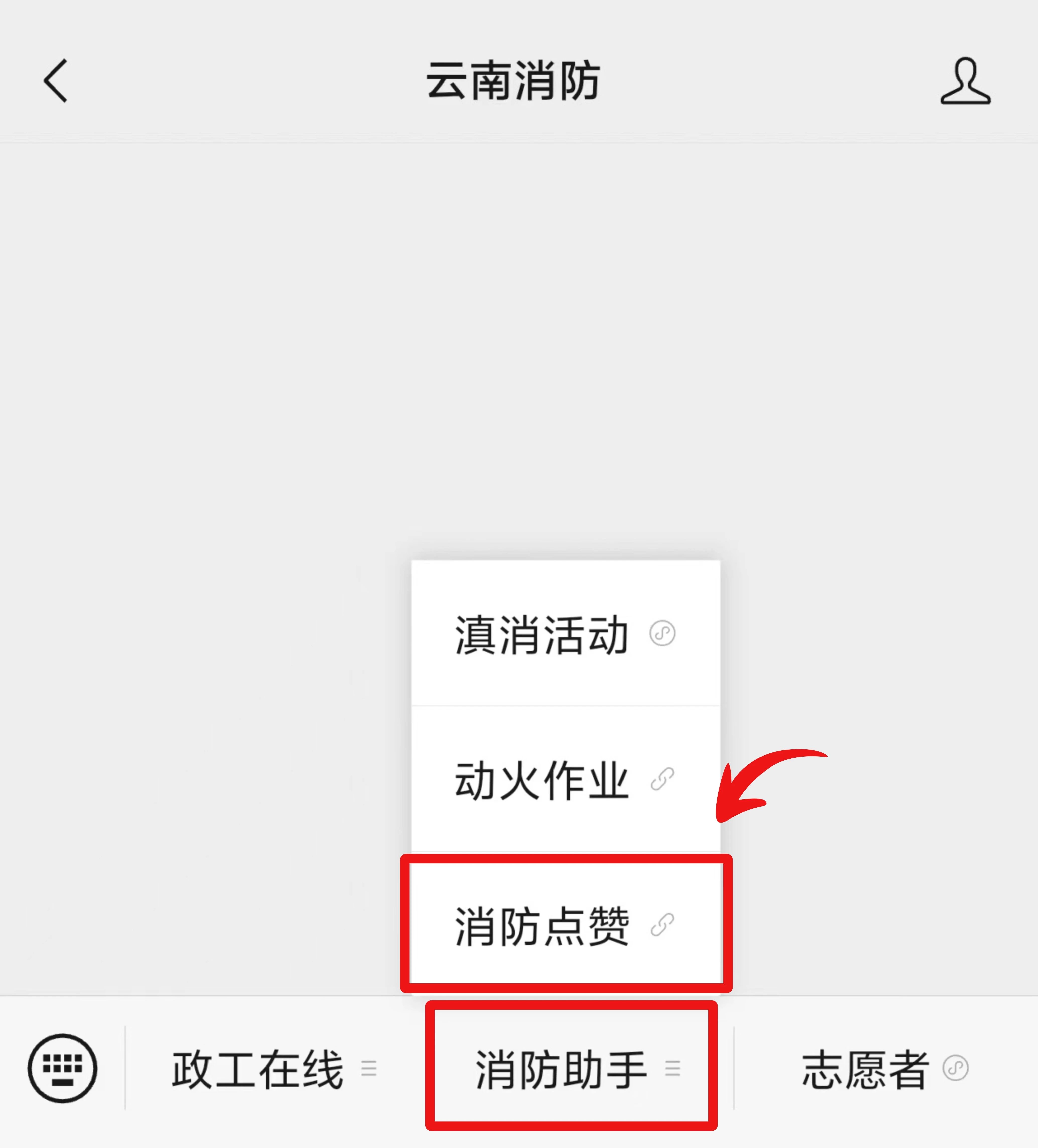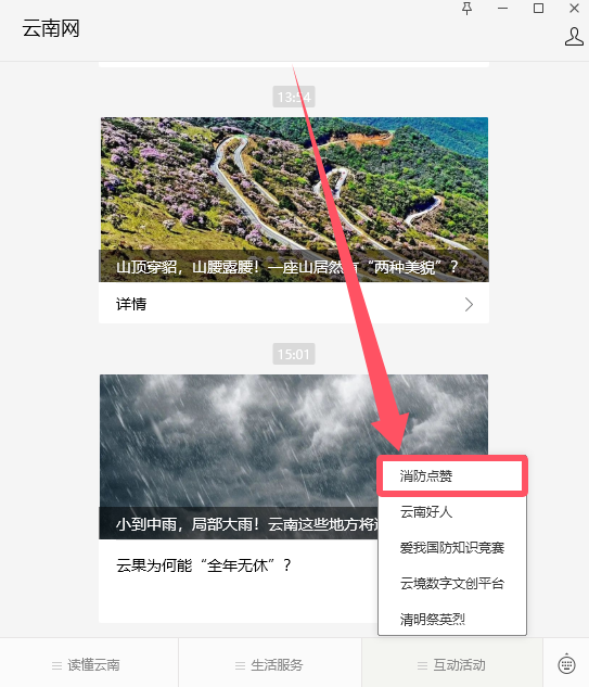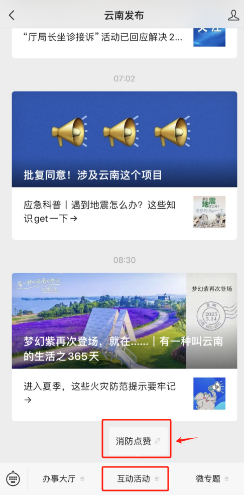 2.在“云南发布”微信公众号首页点击菜单栏“互动活动”“消防点赞”,或在“云南消防”微信公众号首页点击菜单栏“消防助手”“消防点赞”、“云南网”微信公众号首页点击菜单栏“互动活动”“消防点赞”,均可进入点赞页面。