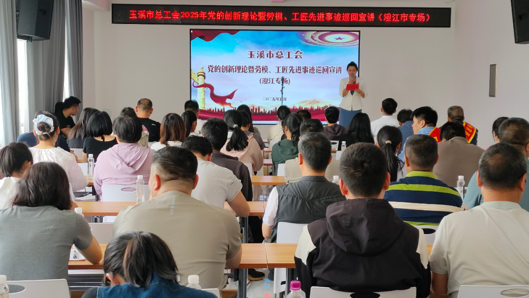 为庆祝中华全国总工会成立100周年,弘扬劳模精神、劳动精神和工匠精神,5月7日,玉溪市总工会深入澄江产业园区开展党的创新理论暨劳模工匠先进事迹巡回宣讲活动。澄江产业园区内企业职工70余人参加听讲。