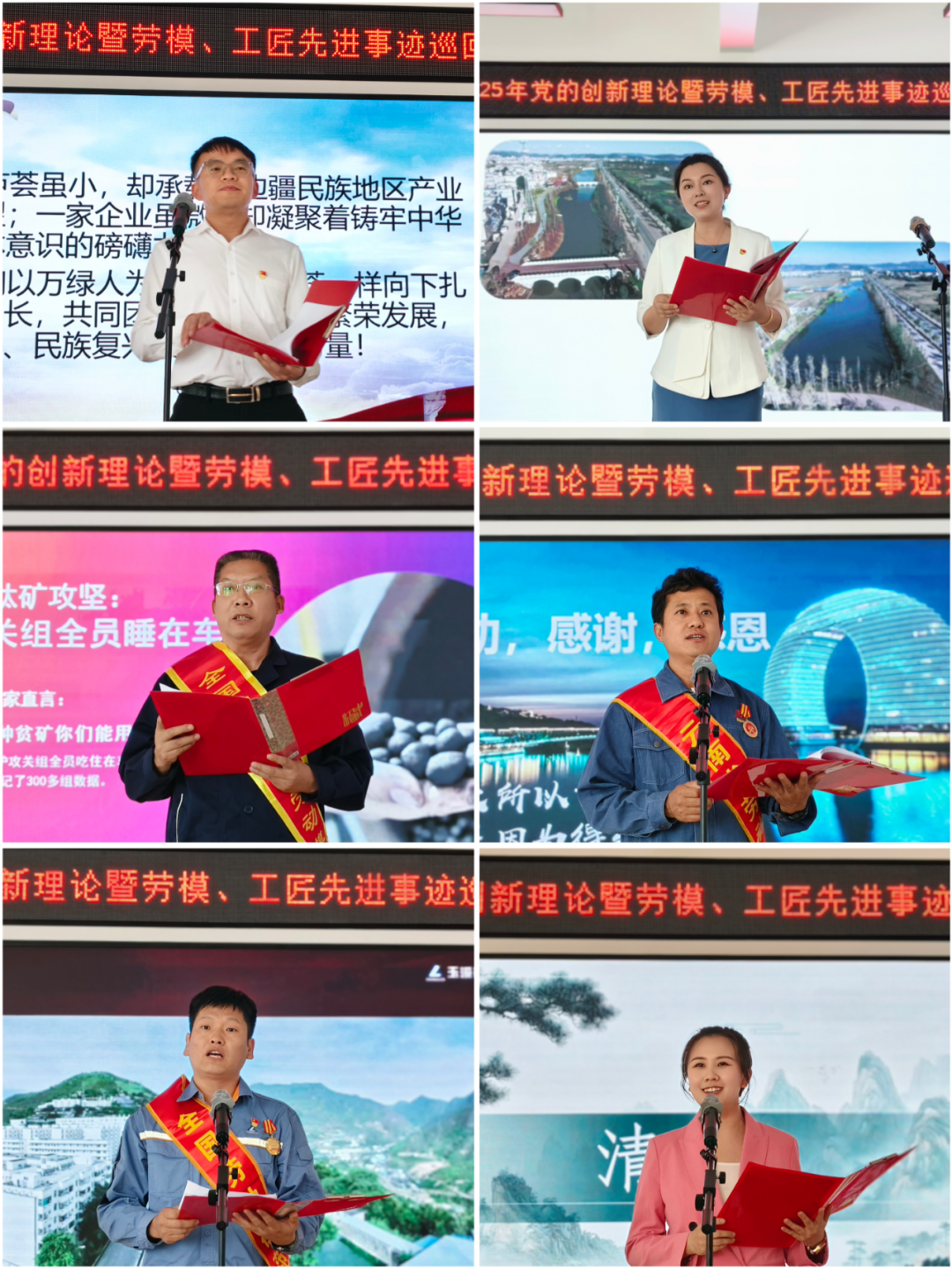 中共玉溪市委党校曹阳《万家春绿共同体 “荟”就民族大团结》,讲述铸牢中华民族共同体意识的重要意义,凝聚共识,让铸牢中华民族共同体意识根植职工心灵深处;玉溪市教育科学研究所冯婷以《万众一心 守护碧水清波》,讲述生态守护故事,贯彻落实习近平生态文明思想和习近平总书记考察云南重要讲话重要指示精神;玉昆钢铁集团冶金高级工程师、全国钢铁工业劳动模范苏加泽以《钢铁人的三把火》分享以匠心铸钢铁、用坚守写担当的奋进事迹;玉溪水松纸厂电气工程师、全国劳模、玉溪工匠王新华《一个电工的进化史》体现“爱岗敬业 争创一流 艰苦奋斗 勇于创新”的劳模精神;玉溪矿业选矿高级工程师、省劳模、云岭工匠缪沅振《选矿工的人生选择》讲述用智慧攻克难关、在平凡岗位上书写不平凡的奋斗答卷;玉溪市总工会毛雨以《为民书答卷清风写答案》共话廉洁初心,共守正道之光。