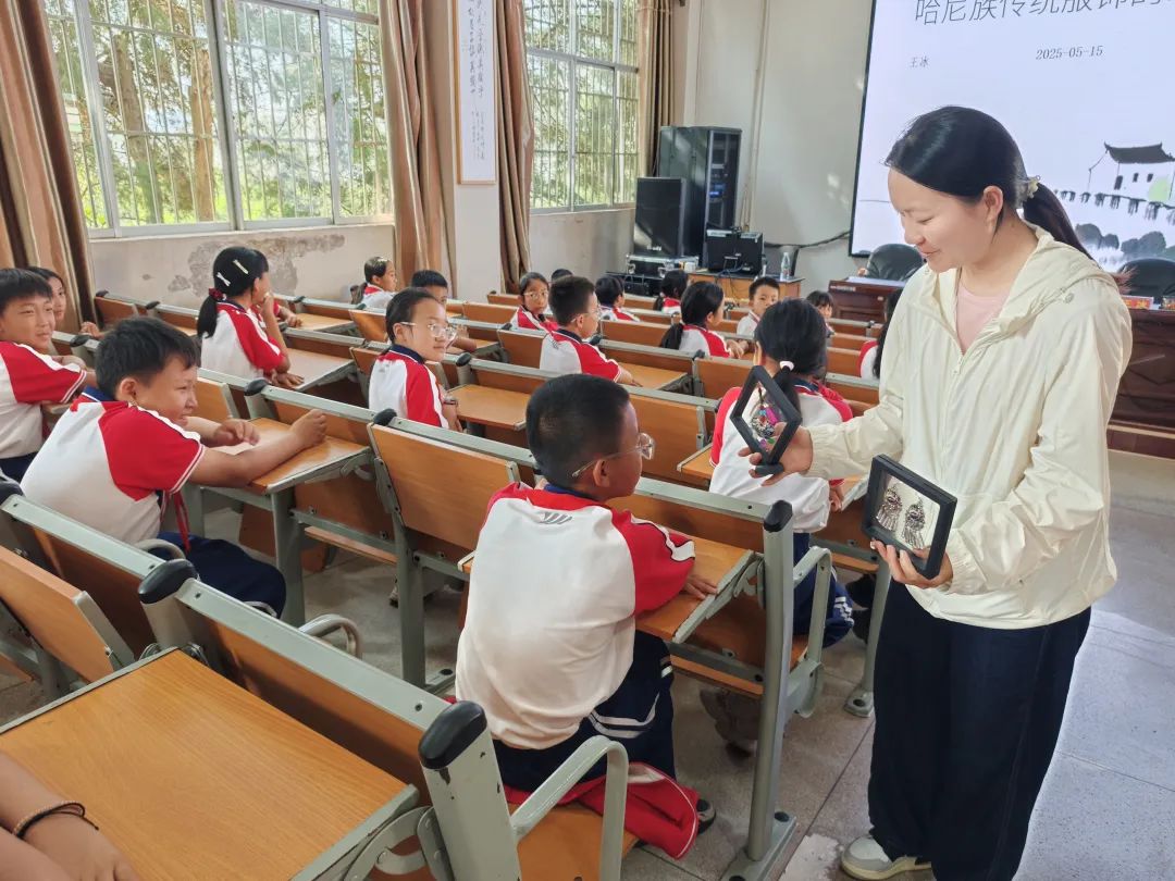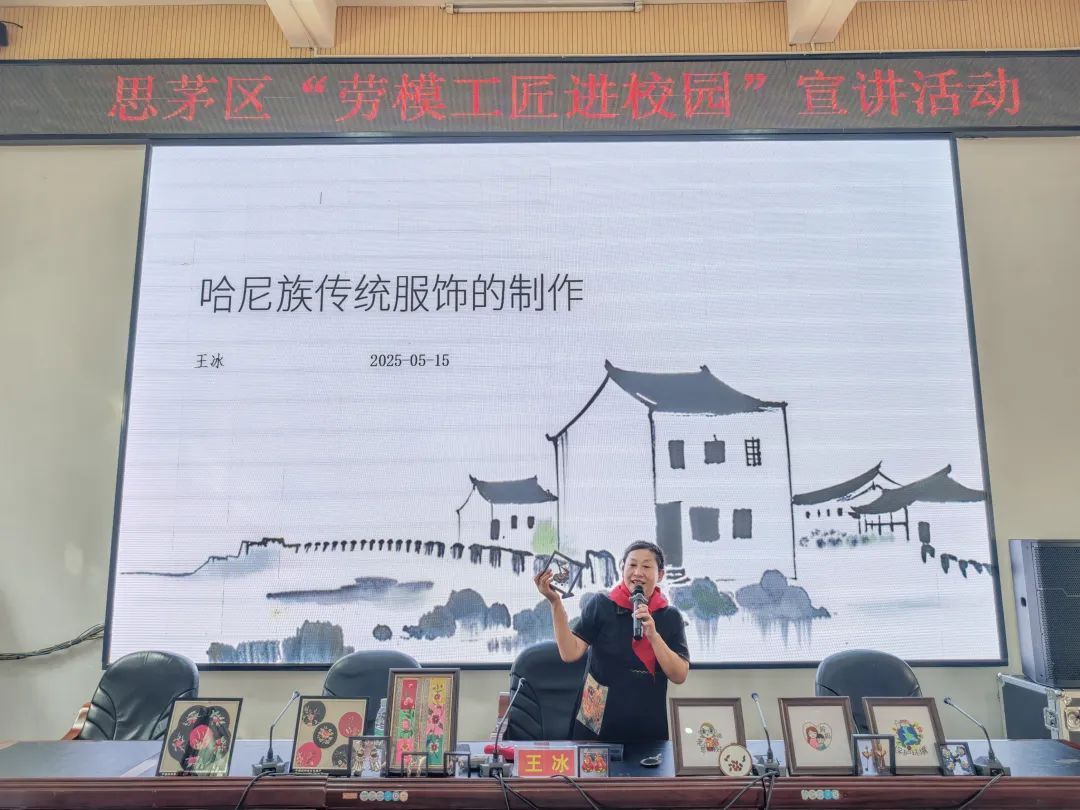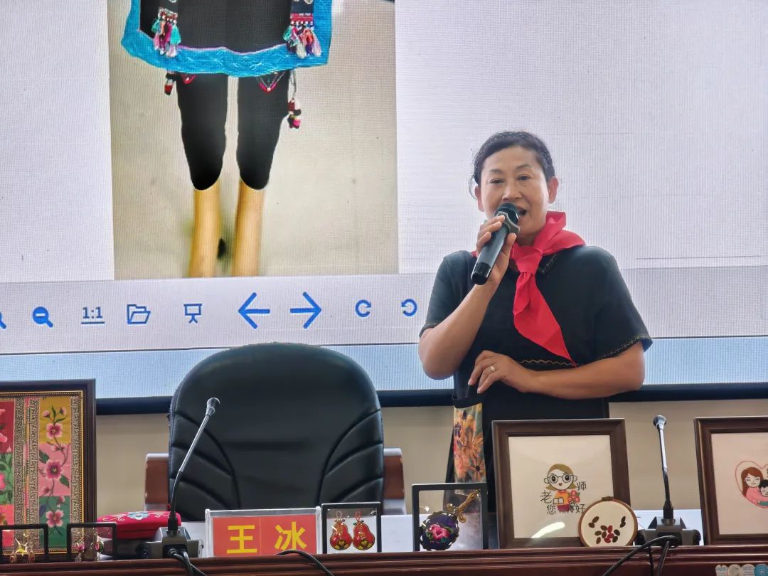 讲座期间,王冰老师以《哈尼族传统服饰的制作》为主题,通过图片、视频以及文创成品展示,生动讲解了哈尼族传统服饰的制作流程。在交流互动环节,同学们积极参与,认真聆听了工匠故事、体悟了工匠精神,纷纷表示要以劳模工匠为榜样,热爱劳动、热爱学习,成为"德、智、体、美、劳"全面发展的新时代好少年。