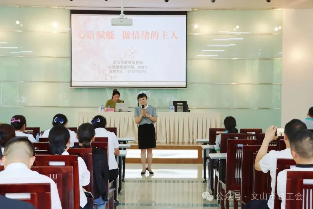 文山市教育体育局心理健康教研组组长张明巧老师以职场压力为切入点,通过真实案例分析,剖析了工作强度大、人际关系复杂等常见问题,引导职工探讨应对策略及解压方法。现场互动频繁,欢笑与思考交织,为职工们打开了缓解压力、积极应对职场挑战的新思路。