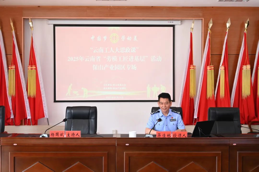 本场宣讲活动由保山市总工会主办、云南保山产业园区工会联合会承办,邀请了保山市公安局刑侦支队警务技术三级主任、“全国人民满意的公务员”“云南省五一劳动奖章”获得者蒋佳林老师为现场130余名干部职工宣讲授课。蒋老师结合自身工作经历,以“爱岗、敬业、奉献、立德”为核心主题,用质朴的语言、真挚的情感、生动的事例分享了自己在岗位上兢兢业业、艰苦奋斗的动人事迹和心路历程,他用实际行动诠释了“爱岗敬业、争创一流、艰苦奋斗、勇于创新”的劳模精神。
