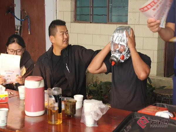 ▲在消防员的指导下,村民学习佩戴防毒面罩,了解其在火场中的重要作用。