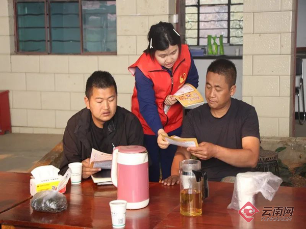 ▲大学生志愿者给村民发放消防宣传资料,提醒大家用火用电安全。