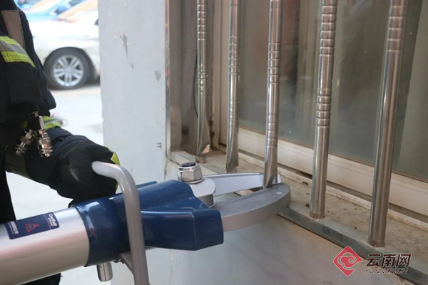 ▲演练模拟电动自行车入户充电起火,在私家车堵塞消防通道、防盗窗锁死的情况下,消防紧急救援的过程。