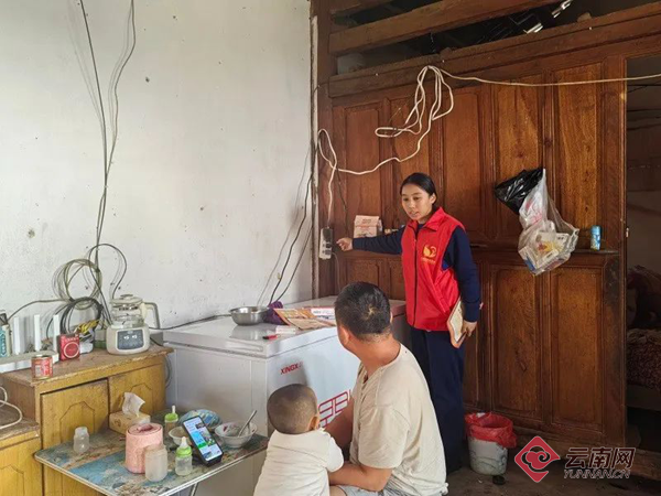 ▲在村干部的带领下,大学生志愿者“敲门入户”为村民排查火灾隐患。