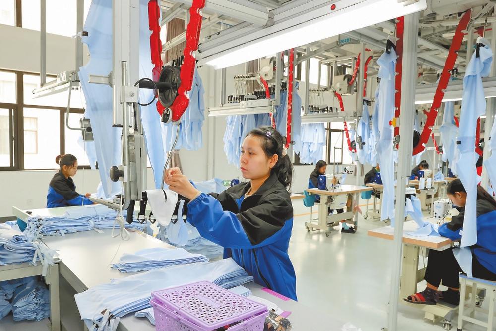 瑞丽沿边产业园雅戈尔服装生产车间工人正忙碌生产。记者 雷桐苏 摄