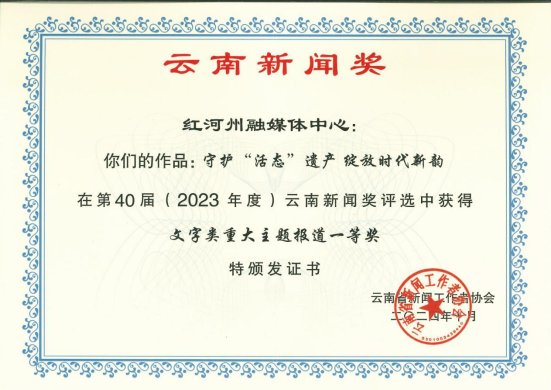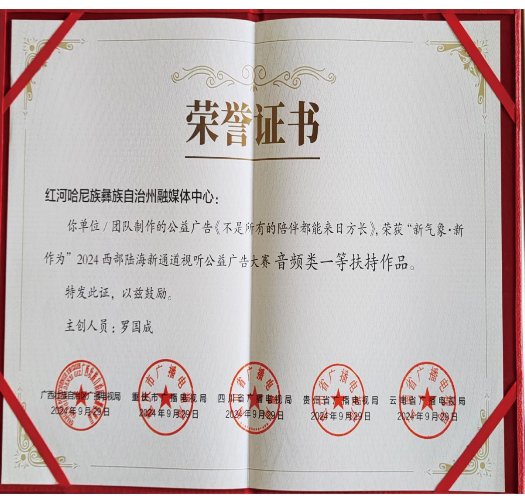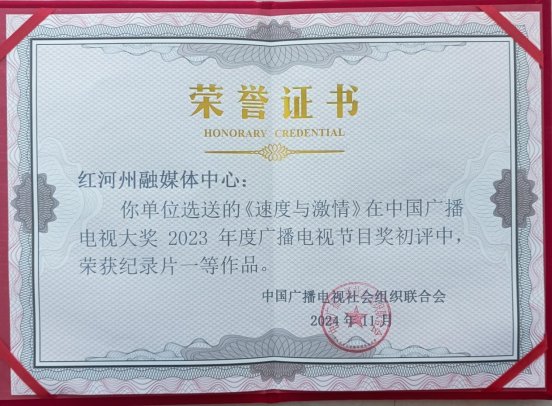 2024年,红河州融媒体中心加大作品创优力度,共有112件原创作品在各级评奖中获奖。纪录片《速度与激情》在中国广播电视大奖2023年度广播电视节目奖初评中获纪录片一等作品;9件作品获第40届云南新闻奖,《守护“活态”遗产绽放时代新韵》获文字类重大主题报道一等奖;《多样秘境生命密码》等3件作品分别获评云南广播电视奖一二等奖;《化泥成陶》《四季梯田》被“第四届海峡两岸暨港澳地区优秀视听作品云展览”组委会推荐为“海融佳作”;《不是所有的陪伴都来日方长》获2024年云南广播电视奖优秀公益广告一等奖、2024西部陆海新通道视听公益广告大赛音频类一等扶持作品;27件作品获中国少数民族地区报业奖,含一等奖3件;13件作品获中国地市报新闻奖,含一等奖2件;35件作品获城市党报新闻奖,含一等奖14件;4件作品在省网信办开展的2023云南正能量网络精品征集展播活动中评为“精品网络正能量作品;4件作品获全省广播电视和网络视听创新创优专项扶持。全年共有90条稿件被央媒各栏目采用,1130条稿件被省媒各栏目采用,广播外宣在云南省16个州市中名列前茅;由中心负责内容建设的“学习强国”红河州学习平台在2024年“学习强国”云南省学习平台建设工作中,累计评价系数居全省第一位。