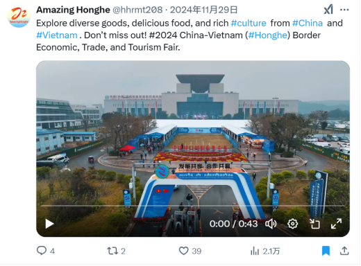 1.持续彰显国际传播效能。持续加强云南省南亚东南亚区域国际传播中心红河分中心建设,以中英、中越双语报道国家领导人出访、出席论坛峰会等重大活动情况,展现大国形象。策划2024中越跨国春晚、2024国际青年世界文化遗产保护主题对话及参访行等海外宣传。Facebook、X、TikTok、Ins等6个海外账号总粉丝量1.32万,共发布图文、海报、短视频等产品3100余条,阅读量472.7万次。受邀参加第四届中国城市国际传播论坛,获得城市(区)国际传播示范案例殊荣。