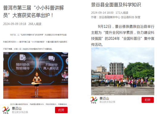 积极普及科学知识,为提高公众的科学文化素质提供舆论支持。2024年,普洱市融媒体中心抓住重要节点、重要事件,全面反映全市科技创新成果,开展科普宣传。在全国科普日、科技活动周等期间,集中展示科技创新成果。发布《科普宣传进校园 气象知识“零”距离》《镇沅县:科普大篷车点亮少年科技梦》等稿件90余条次。广播直播栏目《快乐早点到》《为人民服务》开设“清晨深呼吸”“健康科普”等专栏,播出《这种保温杯会让热水变“毒水”,你可能正在用!》《黑咖啡真的能减肥吗?》等科普宣传298条,播出科普节目《带状疱疹的疼痛治疗》等64期;《金色年华》开设“普洱市第三届‘小小科普讲解员’大赛”专栏,播出《蛇形摆的秘密》等28条。