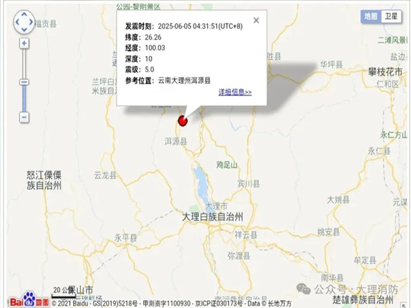 据中国地震台网正式测定,2025年6月5日4时31分在云南大理州洱源县发生5.0级地震,震源深度10公里,震中位于洱源县三营镇(北纬26.26度,东经100.03度)。