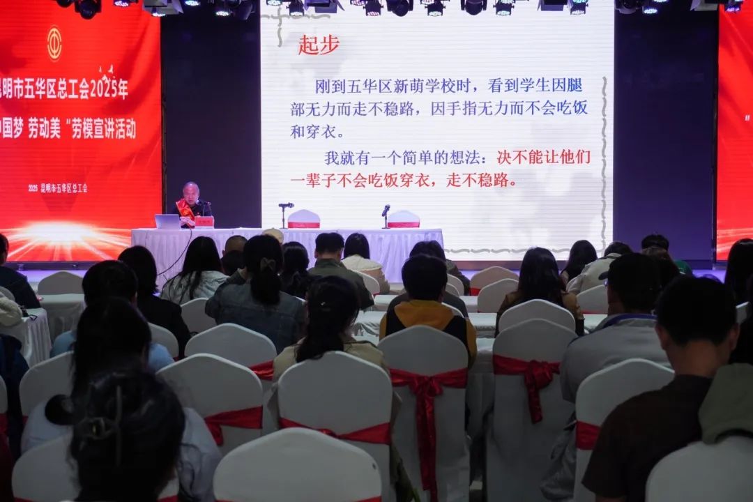 为深入学习贯彻党的二十大精神,庆祝中华全国总工会成立100周年,进一步弘扬劳模精神、劳动精神、工匠精神,5月29日下午,五华区总工会组织“中国梦·劳动美”劳模宣讲活动走进五华产业园区,邀请全国先进工作者代建荣为园区企业职工开展宣讲。此次活动以传达全国劳动模范和先进工作者表彰大会精神为核心,结合代建荣同志32年深耕特殊教育的感人故事,为园区企业职工带来一堂深刻的思想洗礼与精神盛宴。