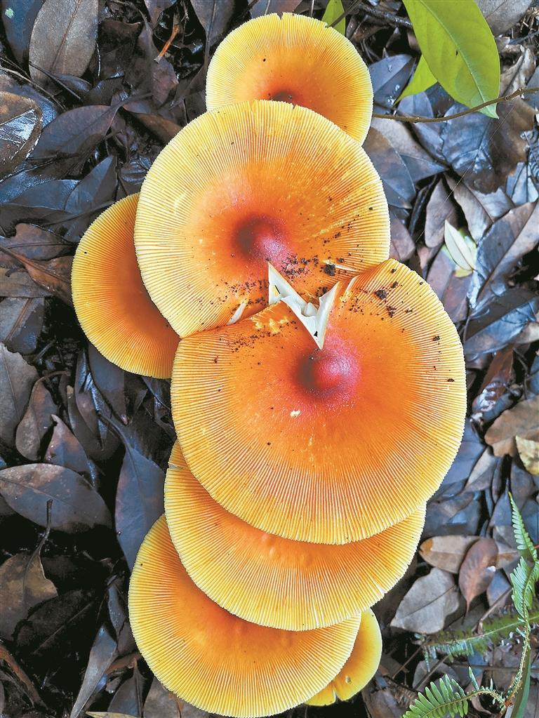 “菌窝”是多年巡山所遇的野生菌“根据地”,每次巡山都收获颇丰。野生菌在阴凉的灌木林下、腐朽的树干旁、湿润的草丛中悄然生长,多与枯叶和环境色相似。我小心翼翼地走着,眼睛不停地搜索着周围的地面,生怕错过任何一个隐藏的宝贝。惊喜不断出现,形状各异的菌子逐一被“探”出,有的菌子像是一把小巧玲珑的伞,精致而可爱;有的菌子则有着独特的形状和颜色,让人惊叹于大自然的鬼斧神工。一边欣赏着它们的美丽,一边仔细地辨别着哪些是可以食用的,哪些是有毒的。可食用野生菌大多颜色朴素,菌褶一般质地均匀,常有独特的香气;而毒菌往往颜色鲜艳,菌褶可能颜色鲜艳,或有斑点、条纹,质地不均匀,菌柄基部有菌托、菌环,一般气味怪异,有刺鼻、腐臭或辛辣等气味,但也有例外,需要认真鉴别。我小心地将可食用的菌子采下,放入篮子里,仿佛收获的是一份份珍贵的宝藏。