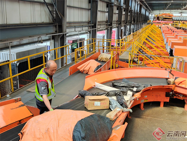 传送带如同流动的云南物产地图:沉甸甸的水果箱里装着云南的芒果、石榴,蔬菜箱里是洋芋、玉米、番茄、洋葱、大蒜,还有来自保山等地的咖啡包裹,“我们和景兰咖啡、喝客咖啡等企业都有合作。”而进港主角是来自全国各地的工业品、日用品、服装等。