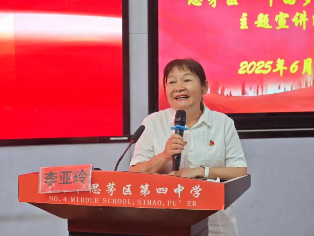 此次宣讲邀请全国优秀党务工作者,云南省劳动模范,思茅区南屏镇倒生根社区党委书记、居委会主任、妇联主席李亚玲到思茅区第四中学开展。