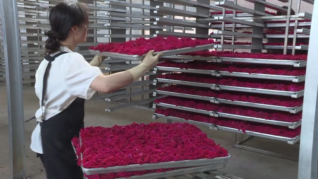 为了延长产业链,我们建了初加工厂,引进了烘干设备,正常情况6至7公斤鲜花能出1公斤干花,一天能(加工)600至700公斤鲜花,我们主要是销往昆明,通过这个产业,我们还带动了30多个村民就业。