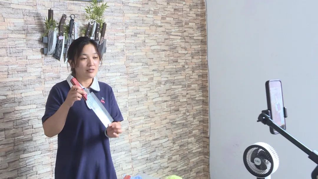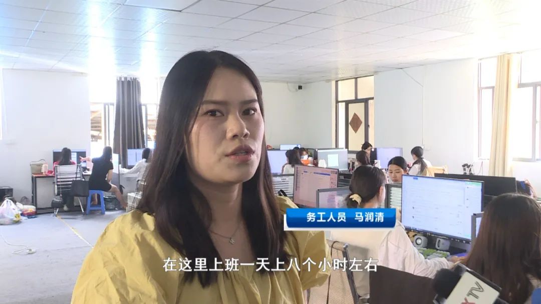 务工人员马润清:我们是一家工厂在广东的源头工厂,我们主要是做平常家里面用的厨房菜刀,有很多款式,主要是做电商平台线上的销售,包括售后,直播等等,我们在这里上班是一个偶然的机会,对我们结了婚有孩子的宝妈来说也很方便,在可以照顾孩子的同时也可以实现有自己一个小小的价值,在这里上班一天上八个小时左右,每个月月休有四到五天,对我们来说还是非常满足了。