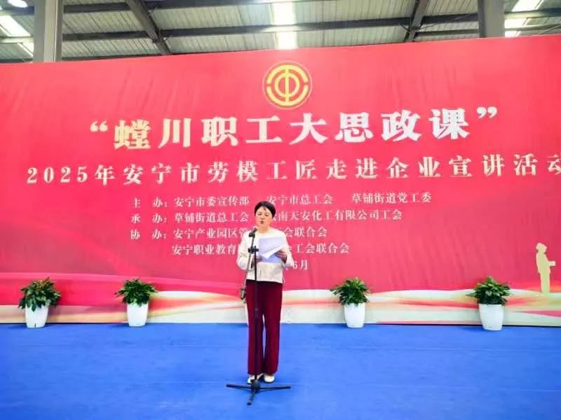 6月27日,一场意义非凡的宣讲活动——“螳川职工大思政课”在云南安宁产业园区化工安全技能实训基地精彩上演。本次活动由安宁市委宣传部、市总工会及草铺街道党工委共同主办,草铺街道总工会与云南天安化工有限公司工会共同承办,安宁产业园区工会联合会、职教园区工会联合会协办。汇聚了来自全市各街道、机关、主管局、管委会及企业的153名职工代表,共同聆听劳模工匠的感人故事。安宁市人大常委会副主任,市总工会党组书记、主席王梅出席此次活动并讲话。