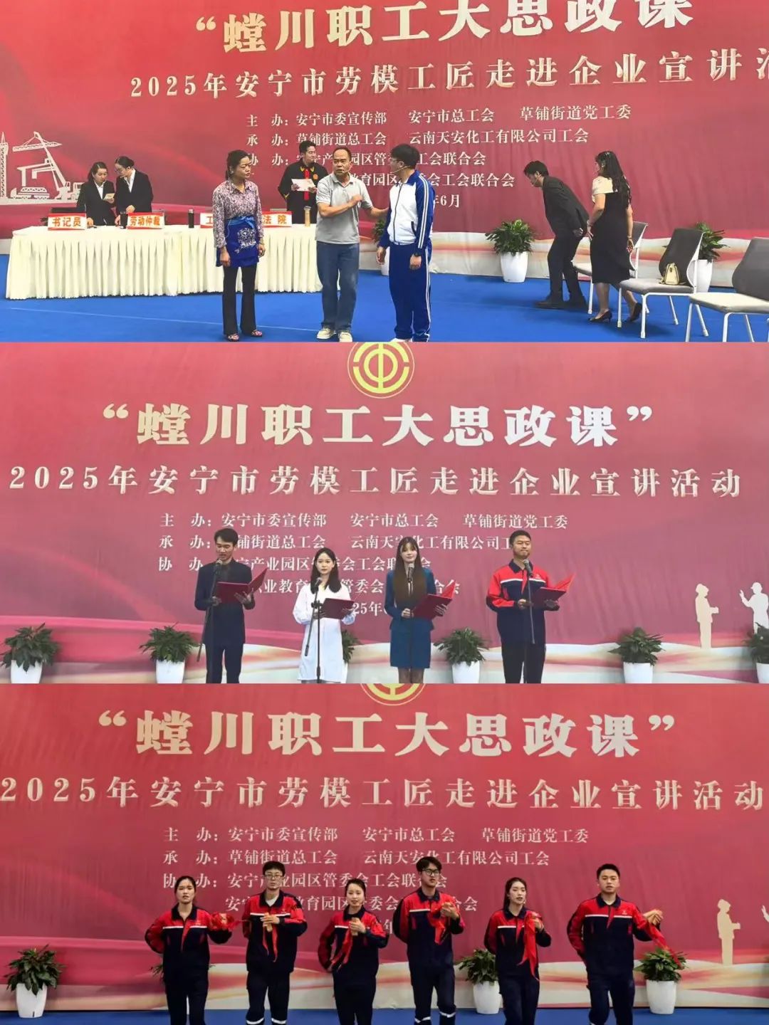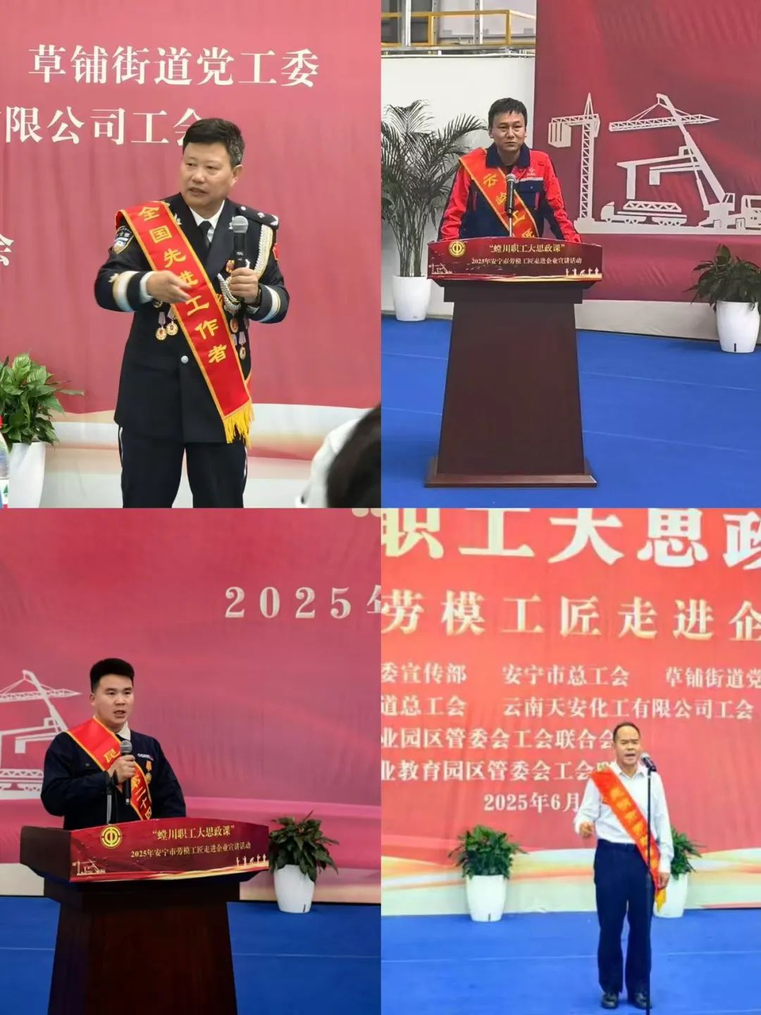 活动的宣讲内容丰富多彩,犹如一幅绚丽多彩的画卷,每一笔都勾勒出时代的印记与精神的内涵。全国先进工作者张绍清以“使命担道义,初心铸警魂”为信念,在刑事技术岗位上深耕细作,用专业和担当守护公平正义,展现了新时代人民警察的忠诚底色。云岭工匠陈甲从平凡技术人员到行业标兵,用“一个平凡技术人员的成长故事”诠释了执着专注、精益求精的工匠精神,为安宁化工产业升级注入了创新动能。昆明市劳模肖毕勇临危受命挽回企业损失,带领团队攻坚克难,助力公司拓展海外项目。用实干推动传统产业向低碳化、智能化转型,彰显了新时代产业工人的责任担当。云南省金牌劳动关系协调员、昆明市劳动模范朱绍宏以“用心筑梦、用爱筑家”为理念,在基层工会岗位上搭建劳资和谐桥梁,生动展现了工会干部服务职工、奉献社会的情怀。