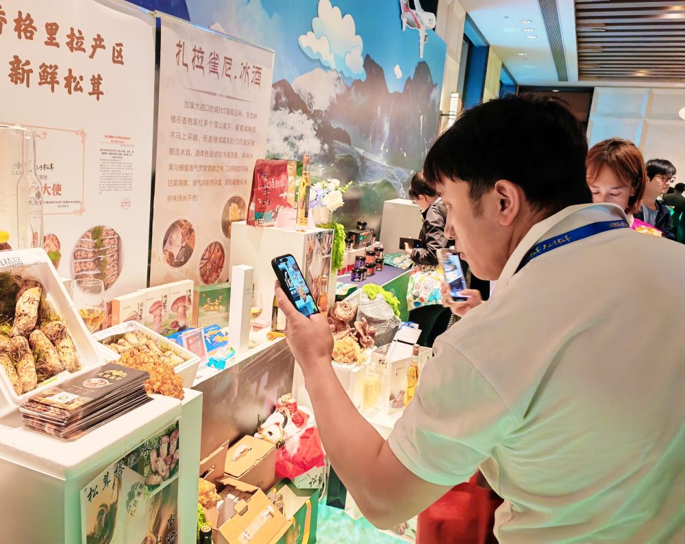 7月4日,一名采购商在第三届香格里拉松茸论坛上拍摄松茸。新华社记者 浦超 摄