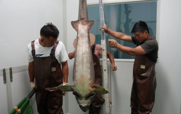 工作人员要定期给鲟鱼进行穿刺,根据鱼卵的成熟度以及直径大小来判断是否可以进行冬化处理,符合标准后还需提前两个月放进5℃的低温冬化池进行净化,这样取出的鱼卵,品质才能更高。