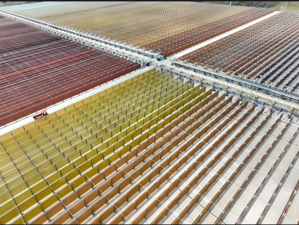 去年12月,这里的雨生红球藻养殖生产线全部投入使用。航拍视角下,养殖生产线玻璃管中的雨生红球藻根据养殖周期长短,呈现出浅绿、深红等颜色,十分壮观。待基地深加工生产线建成后,预计年产值达12亿元。