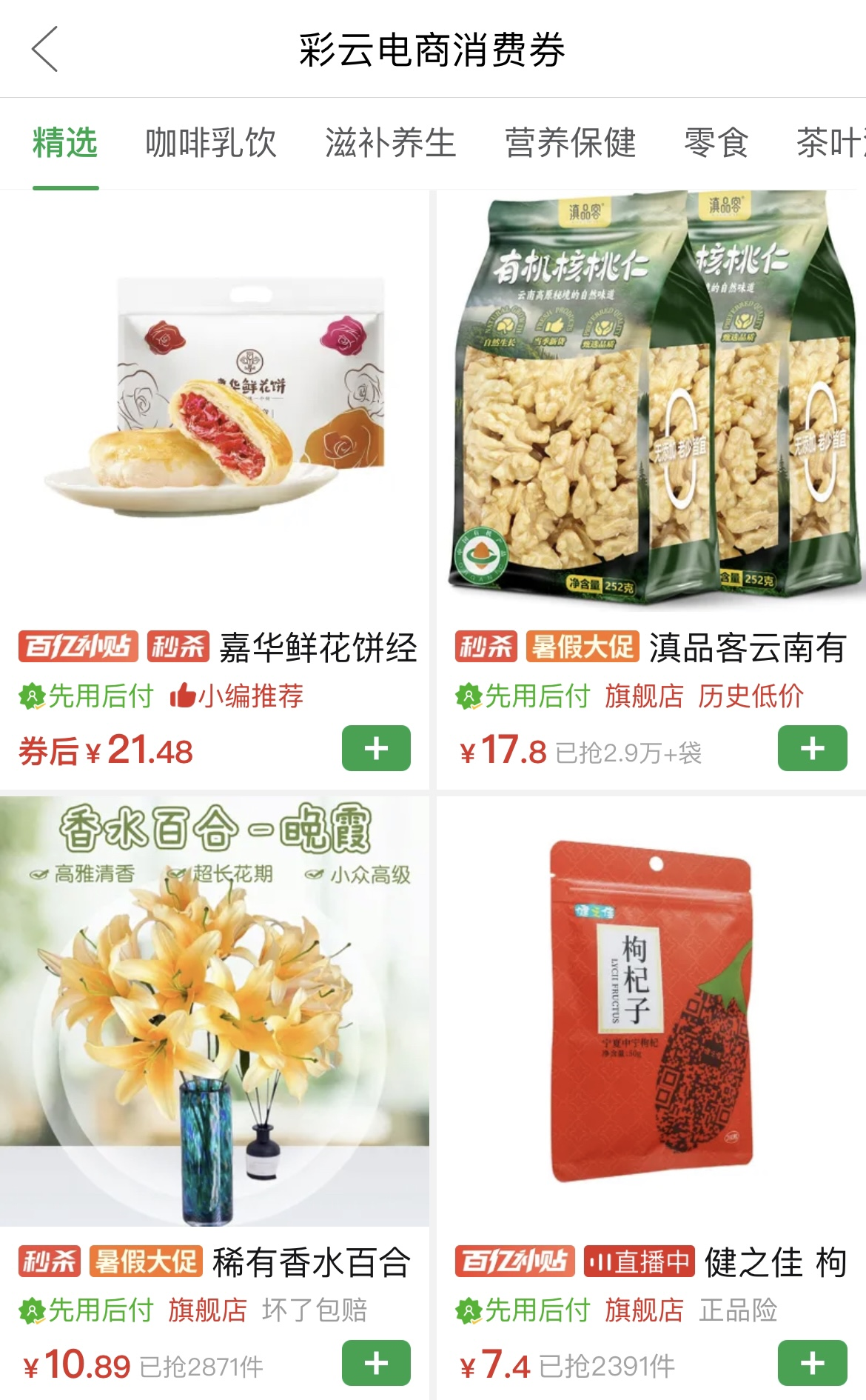 目前,拼多多已上线“彩云电商消费券”活动专区,集中展销茶叶、鲜花、水果、咖啡等极具地域特色的优质产品,最新一期活动将在7月19日再次上线。