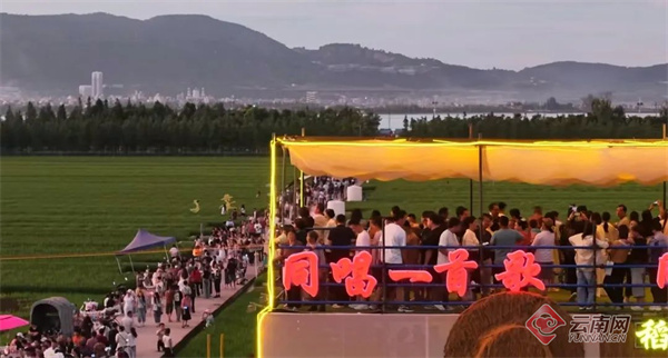 众多游客在通海六一社区牛角坝塘稻田游玩 龚瑞清 摄
