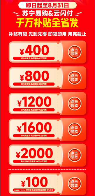 【使用规则】厂补券需在苏宁易购线下门店核销,每日09:30开放领,即领即用。票券有效期7天,不足7天以实际活动结束日期为准。