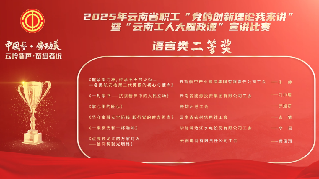 云南省能源投资集团有限公司的刘巾瑾在语言类宣讲中荣获二等奖,她高兴地说:“很荣幸有机会代表能投集团参加全省的职工宣讲比赛,能站在这个宣讲的舞台,内心既激动又忐忑。激动的是,有机会用自己对党的创新理论的理解和学习,与全省优秀的选手交流切磋;忐忑的是,如何把党的创新理论和集团的故事,转化为打动人心的语言。此次比赛不仅是一次展示的舞台,更是一次学习成长的机会,选手们用小切口讲述大道理,用鲜活的故事、生动的语言,让我既感受到语言魅力,也让我对党的创新理论有了更深的理解。”