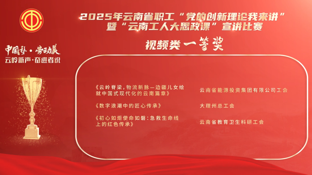 云南省能源投资集团有限公司工会选送的视频类一等奖作品《云岭脊梁,物流新脉——边疆儿女绘就中国式现代化的云南篇章》用一帧帧精彩的画面生动展现了云岭物流产业日新月异的发展和物流一线职工的担当奉献。
