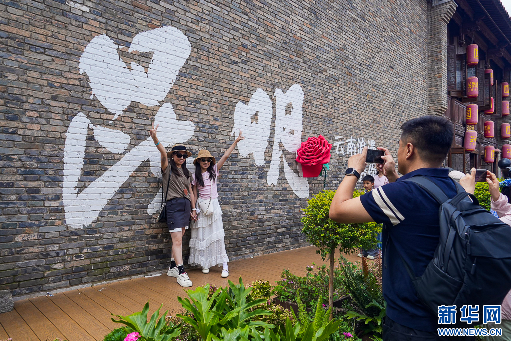 游客在昆明老街网红打卡墙拍照打卡(8月10日摄)。新华网发(郑益 摄)