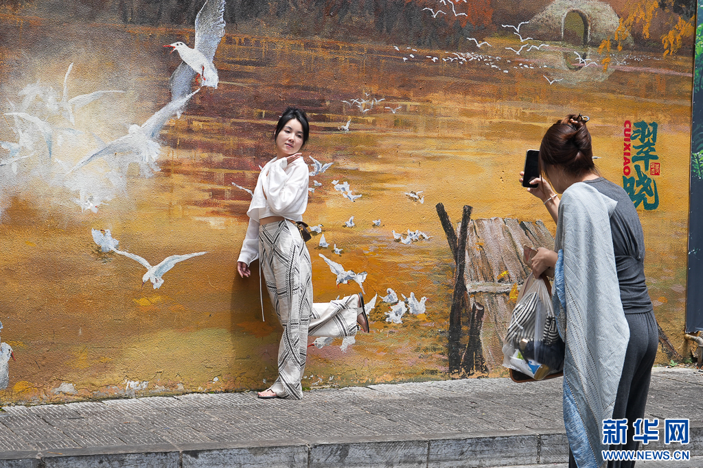 游客在昆明新晋网红打卡点黄公东街拍照打卡(8月10日摄)。新华网发(郑益 摄)