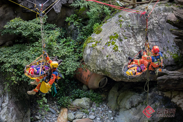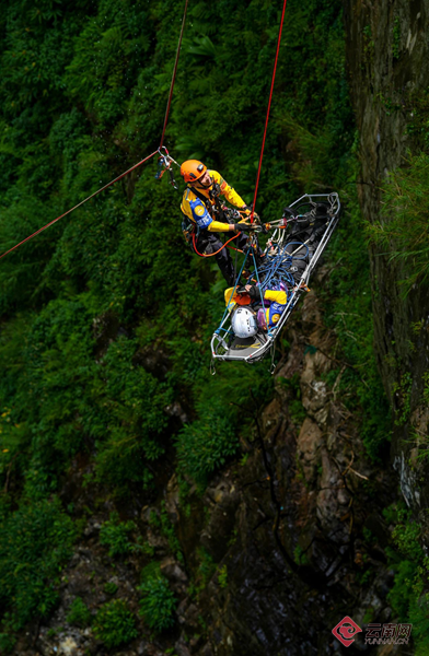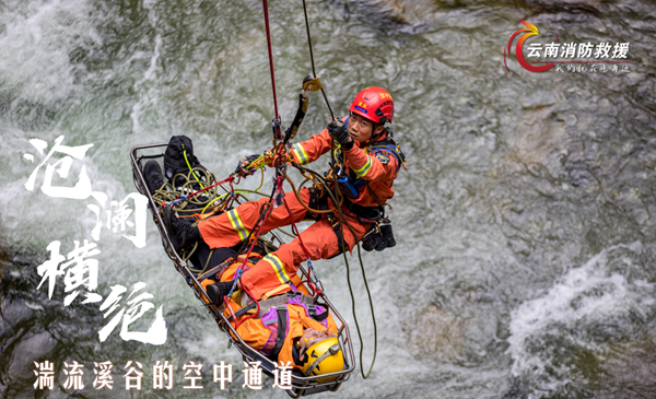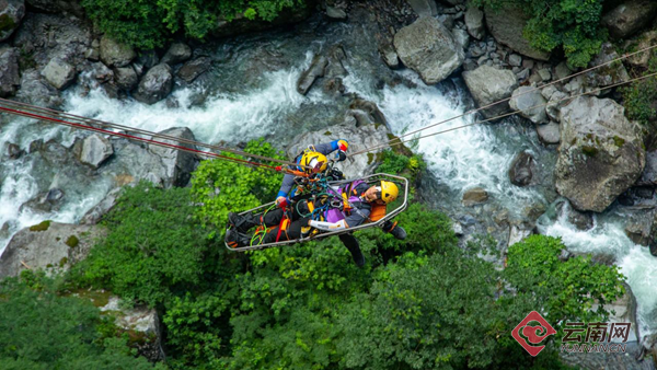 “绳桥已架设完毕,担架手准备就绪,开始牵引至被困者上方!”随着指挥员一声令下,绳桥如银练般横跨断崖沟渠,一场模拟坠崖导致群众被困溪谷的救援行动正式展开。