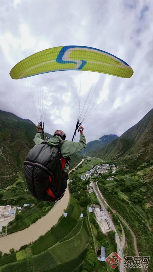 座谈会后,德钦县人民政府副县长拖顶达瓦宣布“霞若乡白水漂流嘉年华”开幕,竞赛活动正式开始。试漂队率先出发,随后背包船、硬艇竞相逐浪。冲锋号角刺破峡谷的宁静,浪涛翻涌间,各色船艇如离弦之箭,劈波斩浪。桨叶翻飞,人舟合一,在激流中奋力搏击。峡谷之上,“乌蒙山人”王虹傑自霞若群山之巅御风而下,滑翔伞如彩翼般划破长空。这是滑翔伞运动在霞若乡的首次成功实践,印证了霞若乡具有打造高端户外运动目的地的巨大潜力。傍晚,霞若乡施坝村燃起篝火,运动员、游客与当地村民手挽手,围着火光载歌载舞,古老的“阿尺目刮”在峡谷间回荡。