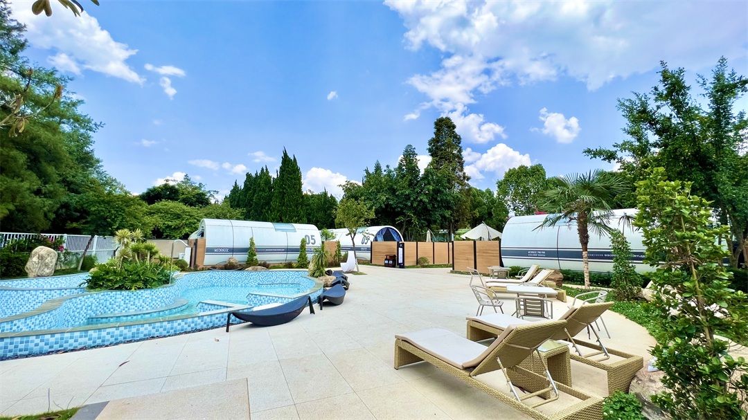 圆梦营“太空舱”以“温泉+烧烤+露营酒店”的方式,让你疲惫的身体和心灵得到慰藉。独立的庭院里,泡池、桌椅、帐篷、烧烤架等一应俱全,可以一边泡温泉,一边烧烤。房间里,大床位于天窗之下,打开天窗,阳光洒在床上,舒服惬意;夜晚,躺在床上便能看星光点点,感受温泉露营的快乐。