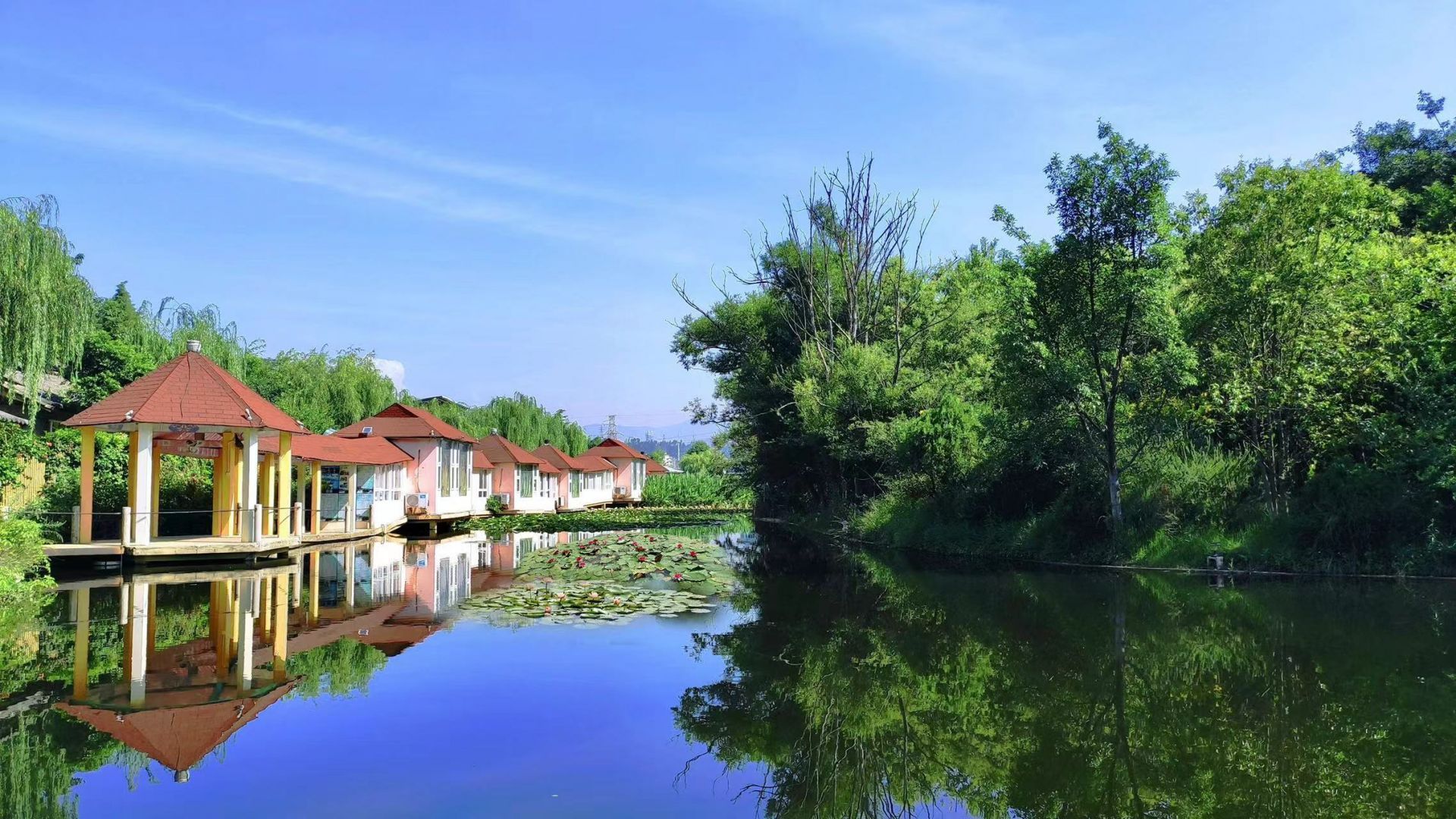 建在温泉湿地水面迴廊之上的水居小屋让人眼前一亮,备受住客喜爱。推窗即见湖景,晨光洒落、荷影摇曳,诗意盎然。