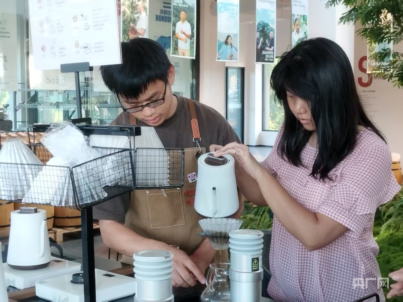游客体验咖啡冲煮(央广网实习记者 白欣然 摄)