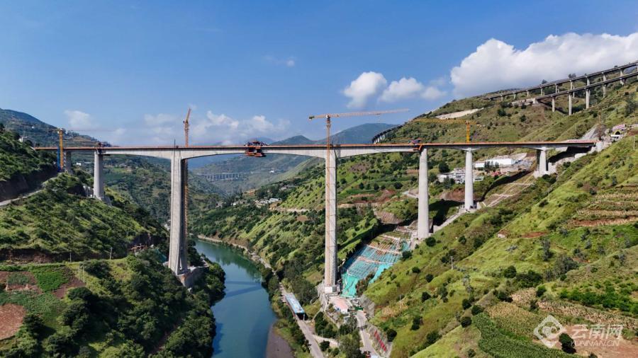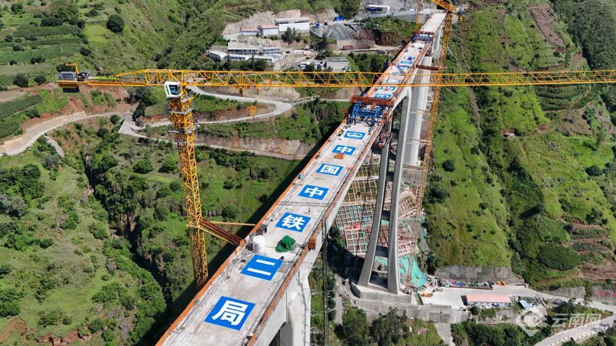 江底牛栏江特大桥位于云南省会泽县和贵州省威宁县交界处,全长568米,连续梁主跨160米,采用刚构连续梁结构,主墩高122米,相当于40层高楼,全桥横跨云贵交界处的牛栏江V形河谷地带,施工场地狭窄,两岸危岩落石频发,是全线重难点控制性工程。面对“高空作业、峡谷风场、生态敏感”等多重施工挑战,建设团队以科技创新破解施工难题。中铁二局渝昆高铁项目部现场负责人介绍,建设过程中,项目团队运用国内领先的全封闭液压爬模系统、智能温控混凝土养护技术、数字建模结合北斗定位系统等,成功解决了高空作业平台全方位安全防护、大体积混凝土浇筑零缺陷、合龙精度控制在毫米级以内等挑战,实现了作业安全和工程质量,为高原峡谷地区大跨度连续梁施工积累了宝贵经验。